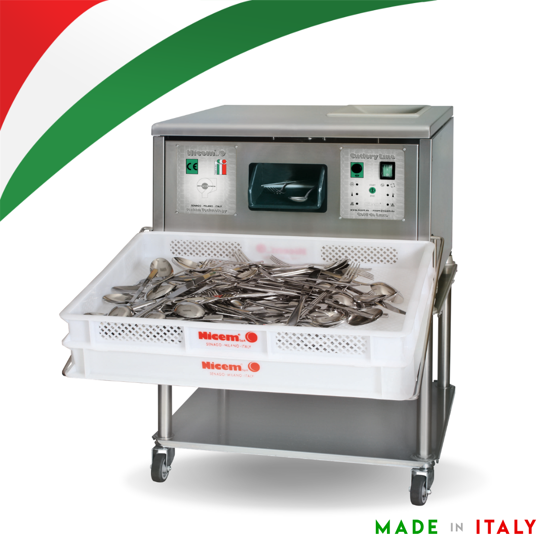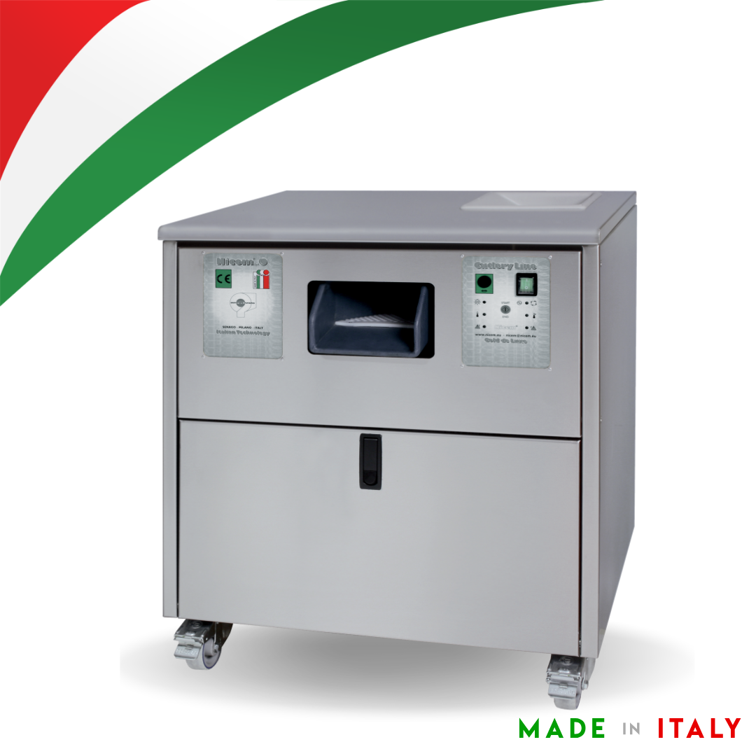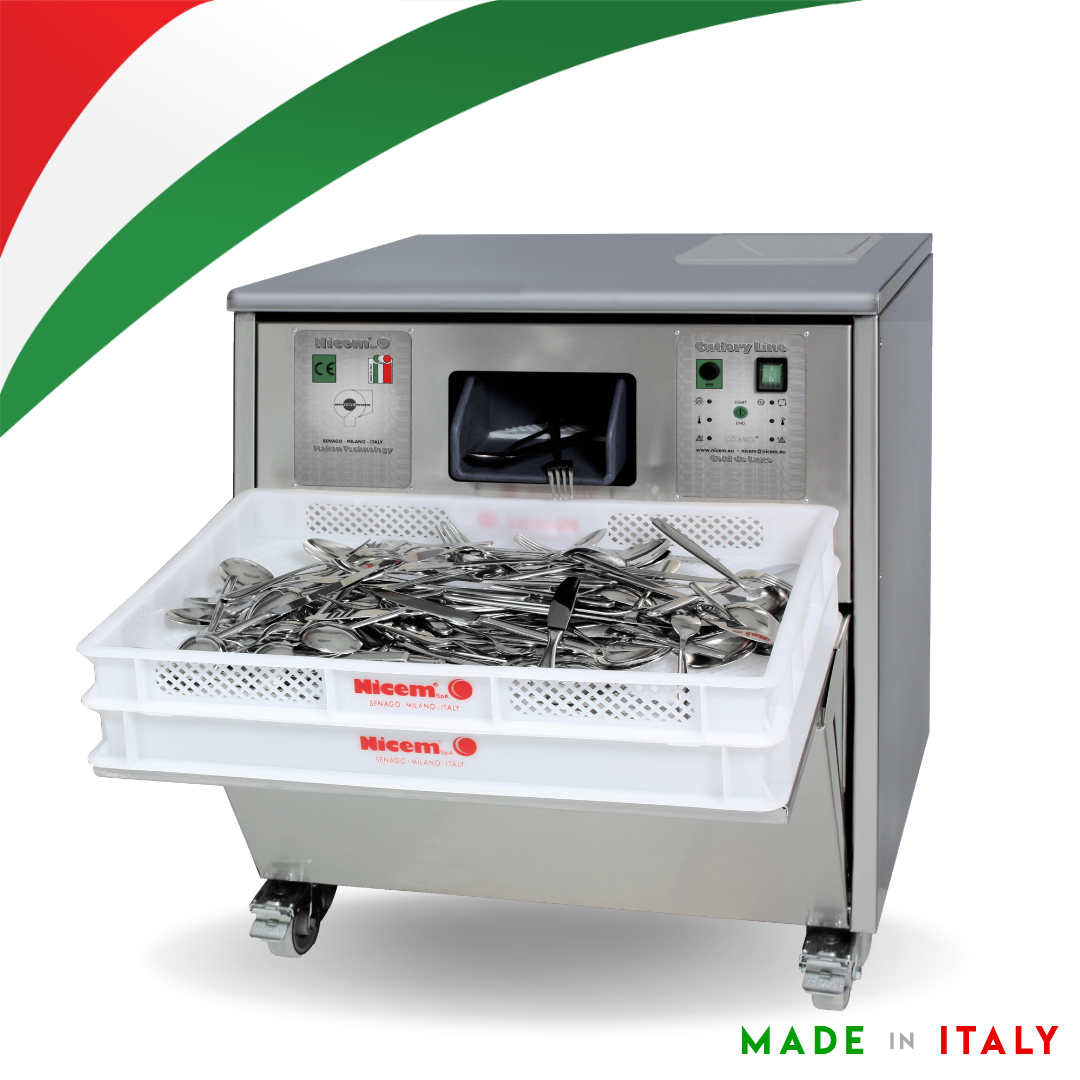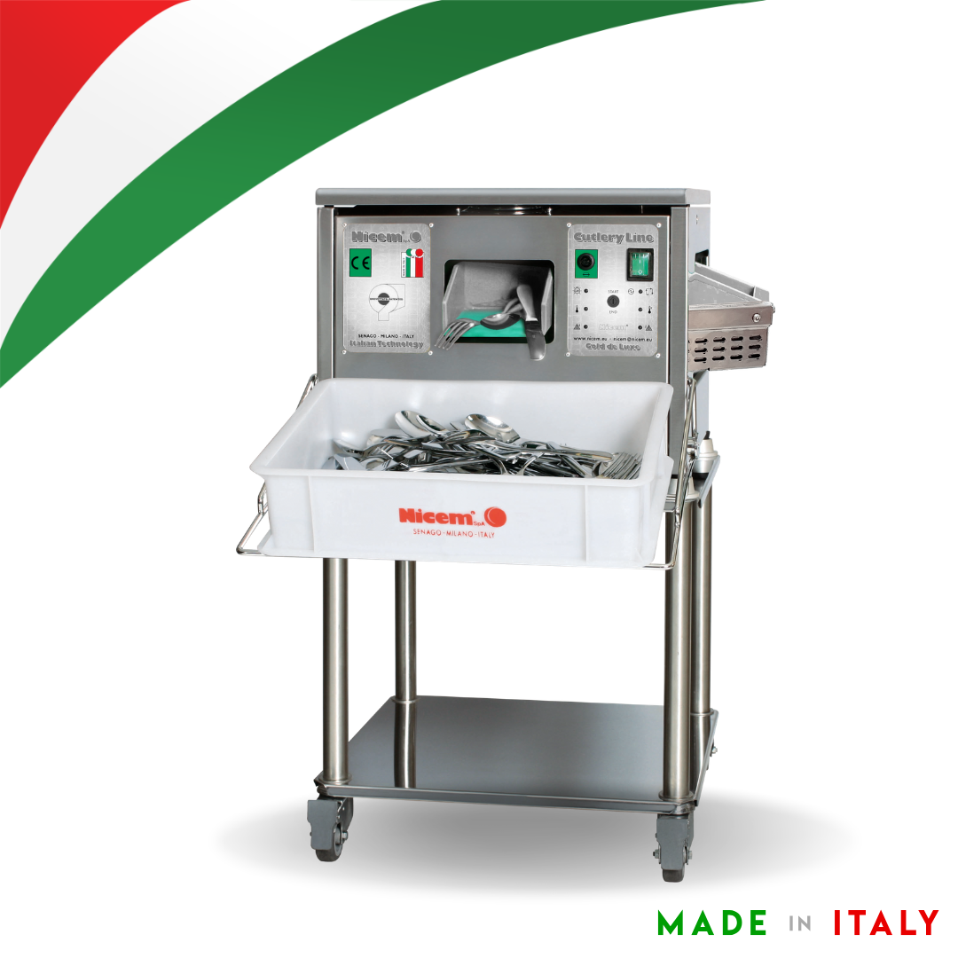 Máquina ASC 30 GIRL seca e lustra talheres de aço inox e prata em segundos, eliminando manchas de calcário e proporcionando um brilho uniforme e impecável.